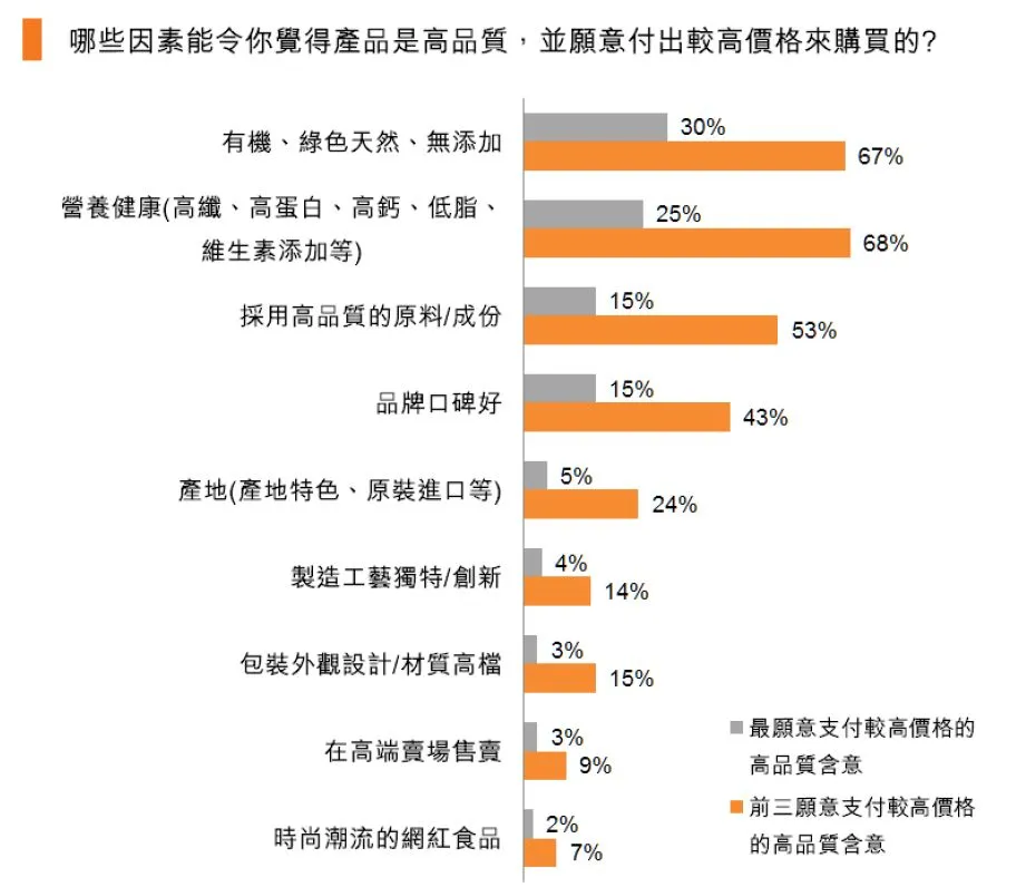 调查反映有机、绿色天然、无添加、营养健康,以及采用高品质的原料、成份被消费者热捧,成为消费者心目中高品质象征,并且愿意为这些高品质元素支付更高的溢价。品牌口碑与高品质的关联大幅下降,侧面反映消费者的品牌忠诚度下降,理性寻找更佳的产品。