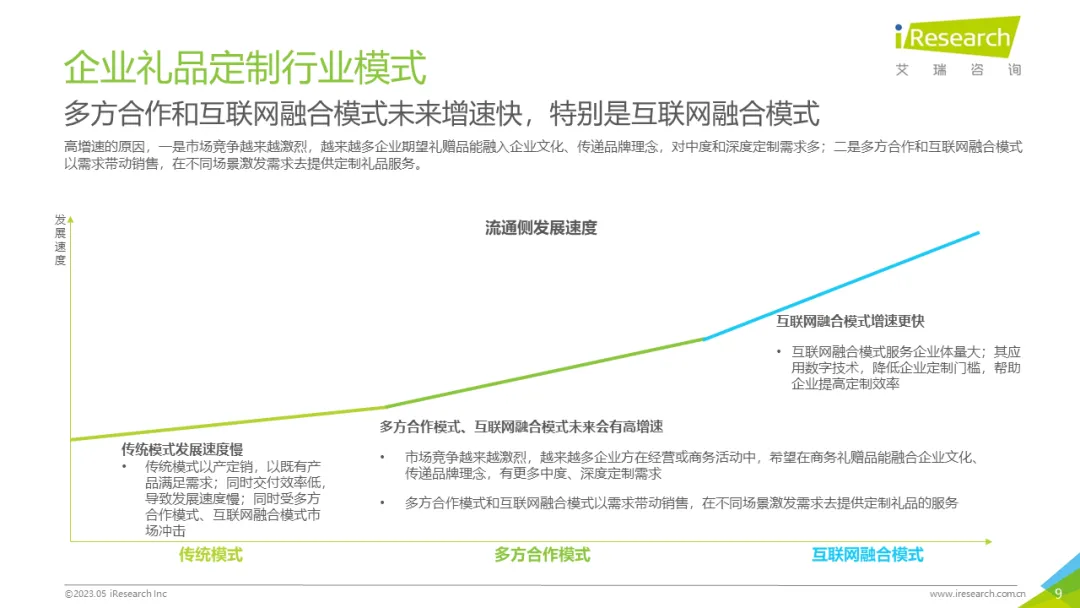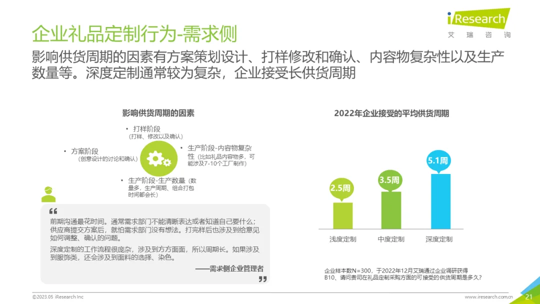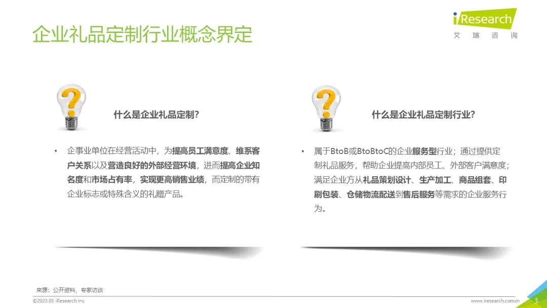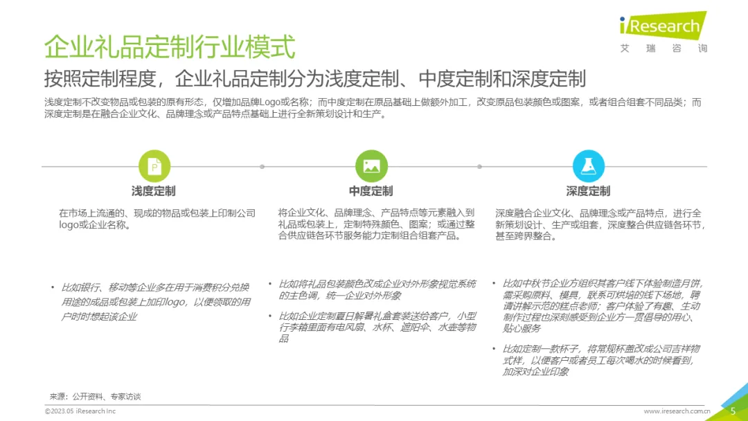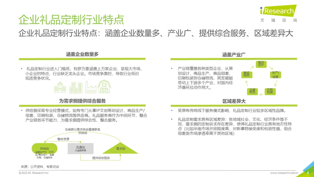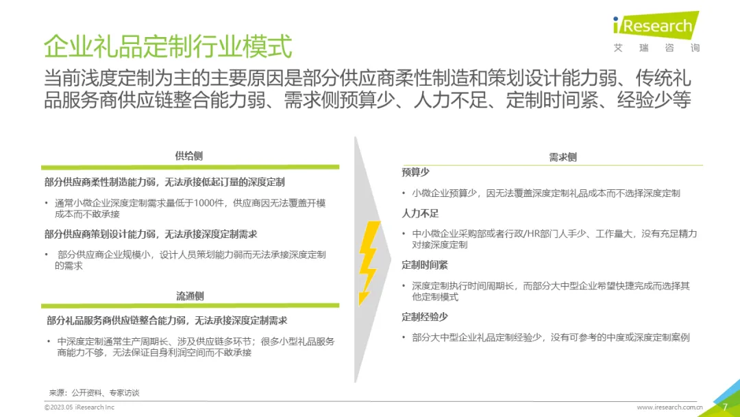 企业礼品定制行业具有涵盖企业数量多、产业广、区域差异大、提供综合服务的特点。当前定制模式以浅度定制为主,主要因为部分供应商柔性制造和策划设计能力弱,传统礼品服务商供应链整合能力弱,需求侧预算少、定制时间紧、经验少、人力不足等导致。