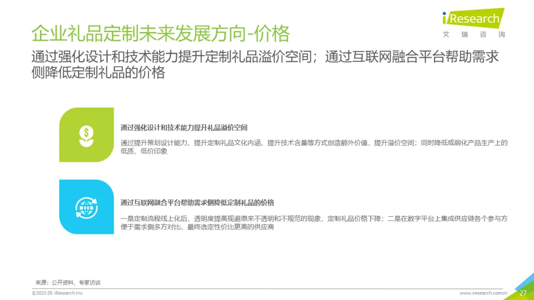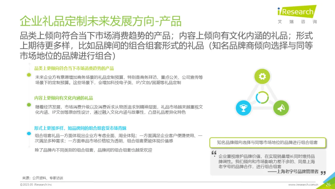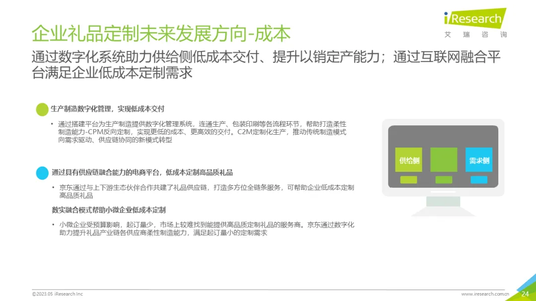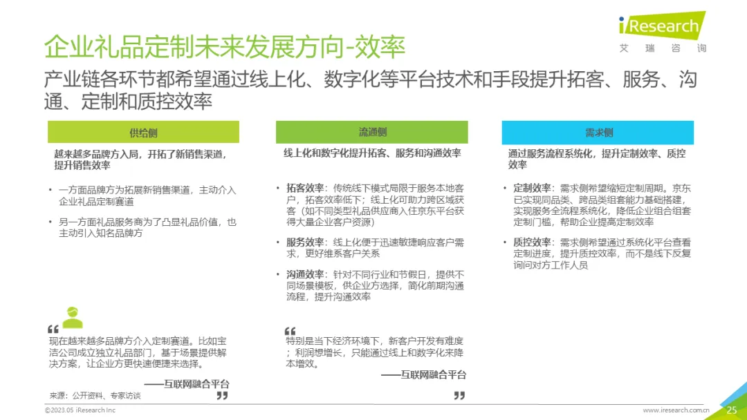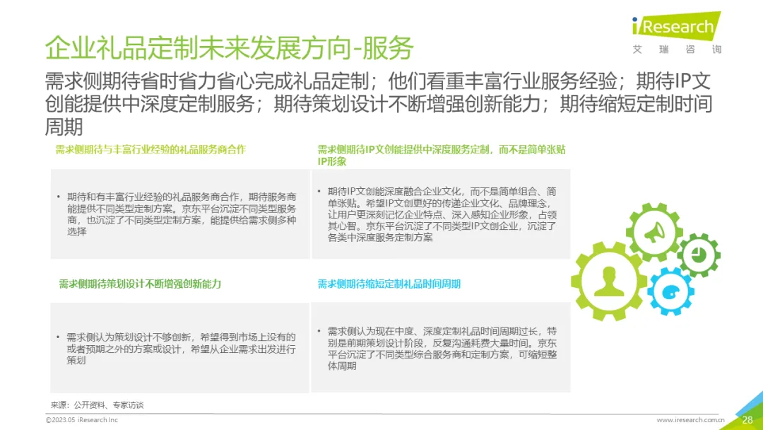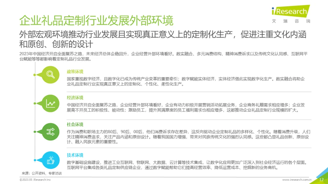 企业礼品定制行业具有涵盖企业数量多、产业广、区域差异大、提供综合服务的特点。当前定制模式以浅度定制为主,主要因为部分供应商柔性制造和策划设计能力弱,传统礼品服务商供应链整合能力弱,需求侧预算少、定制时间紧、经验少、人力不足等导致。