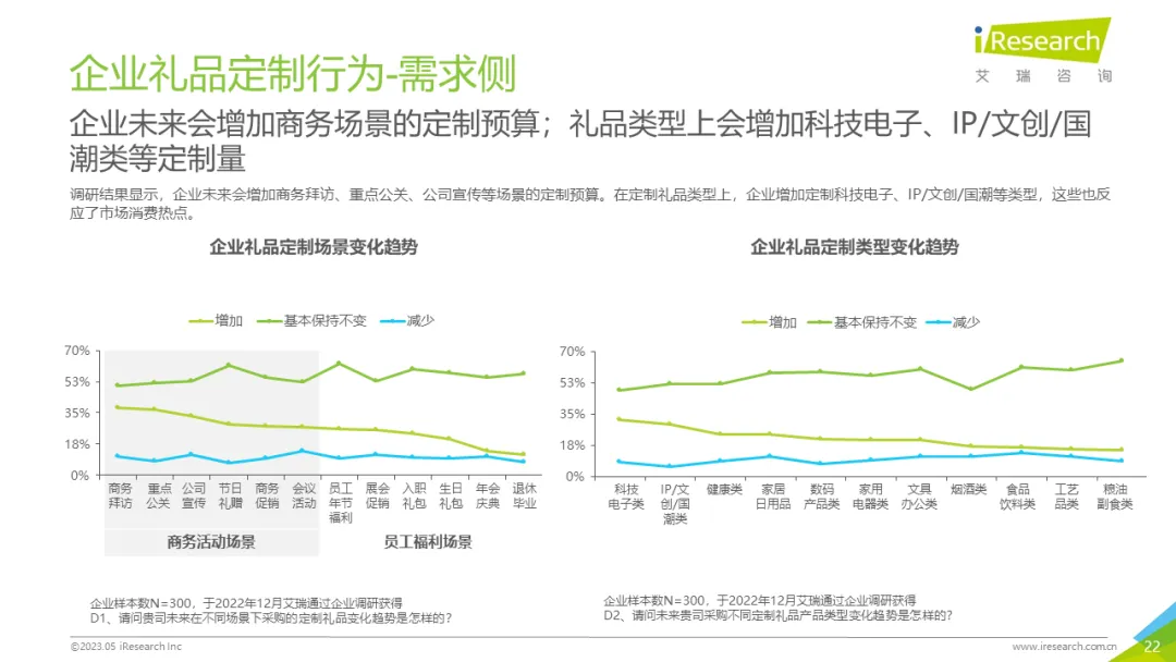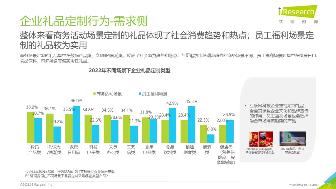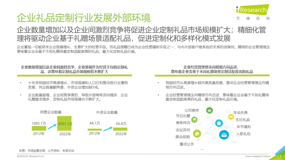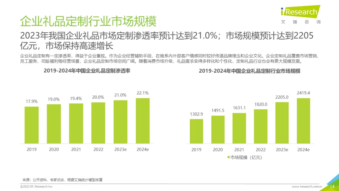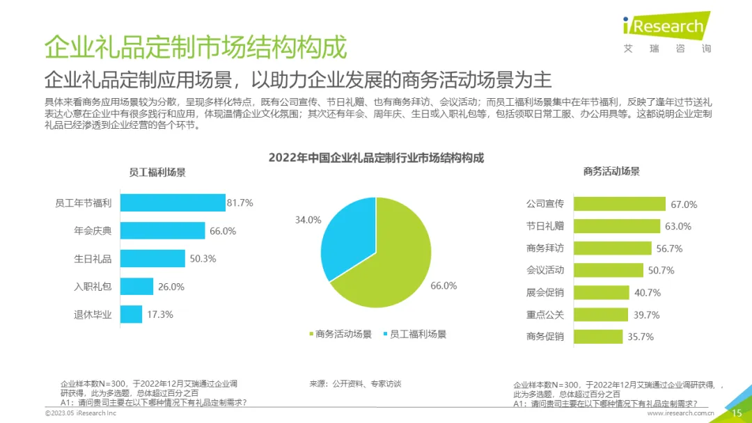 企业越来越重视定制礼品,认为是有效营销宣传、情感维系手段,目前定制礼品有一定市场渗透且保持持续增长态势。2023年企业礼品定制行业市场规模将达到2205亿元。市场结构构成上,以助力企业发展的商务活动场景定制礼品为主。