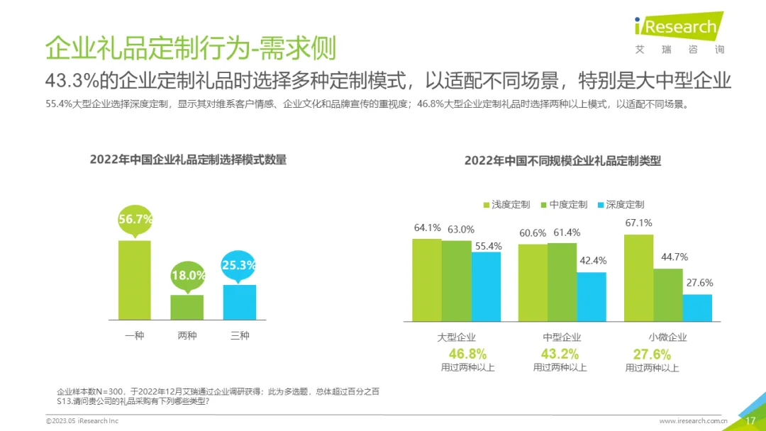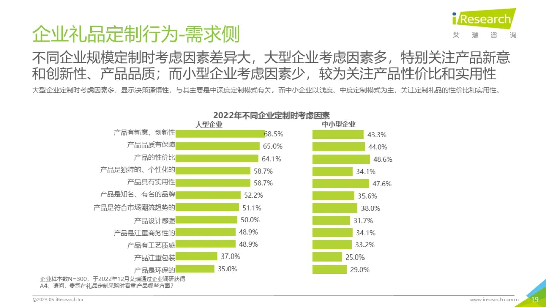 43.3%的企业定制礼品时选择多种定制模式,以适配不同场景。礼品类型上,商务活动场景多选择市场消费趋势和热点的产品,员工福利场景选择实用型产品;配合企业经营需要,商务场景礼品定制频次分散、频繁,员工福利场景定制频次较为集中。不同企业规模定制时考虑因素差异大,大型企业考虑因素多,特别关注礼品新意和创新性、产品品质;而小型企业考虑因素少,较为关注性价比和实用性。