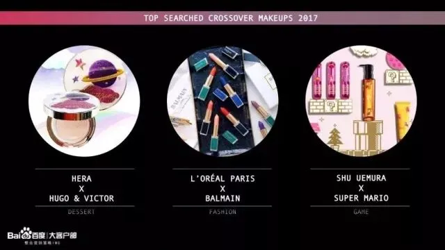 此外,2017年一些彩妆品牌和其他行业品牌、形象的合作也有抢眼表现。这些产品的检索量也因为别出心裁的“跨界”话题在短期内迅速激增。这种形态的跨界产品通常会基于普通版本在产品外壳上搞事,又或是推出一些有带上跨界色彩的新色号、新配色,让产品焕然一新,也让消费者充满新鲜感。