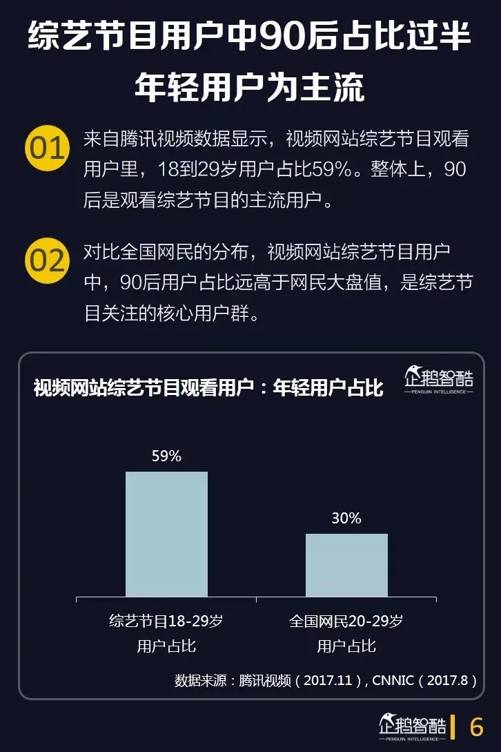 视频网站上观看综艺节目的人群中,超过一半是90后,且这部分用户观看综艺节目的时长高于年长人群。