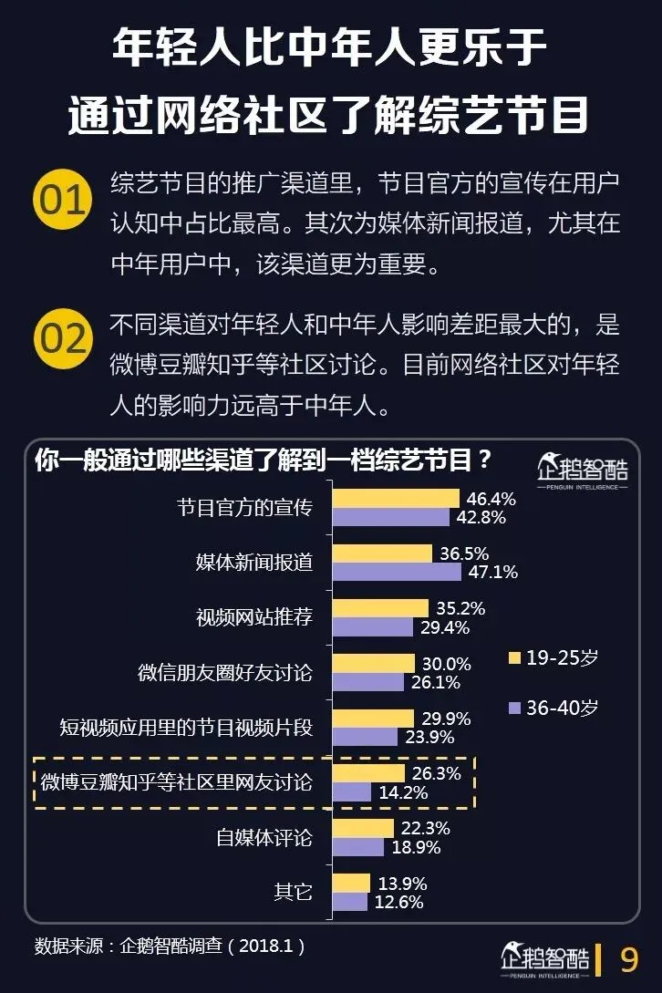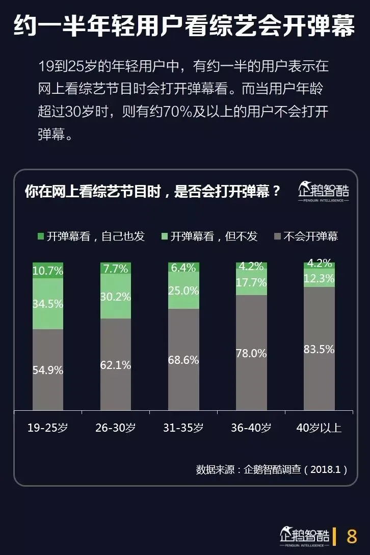 19到25岁的年轻用户中,有约一半的用户表示在网上看综艺节目时会打开弹幕看。互动社区是他们获取和表达意见的阵地。