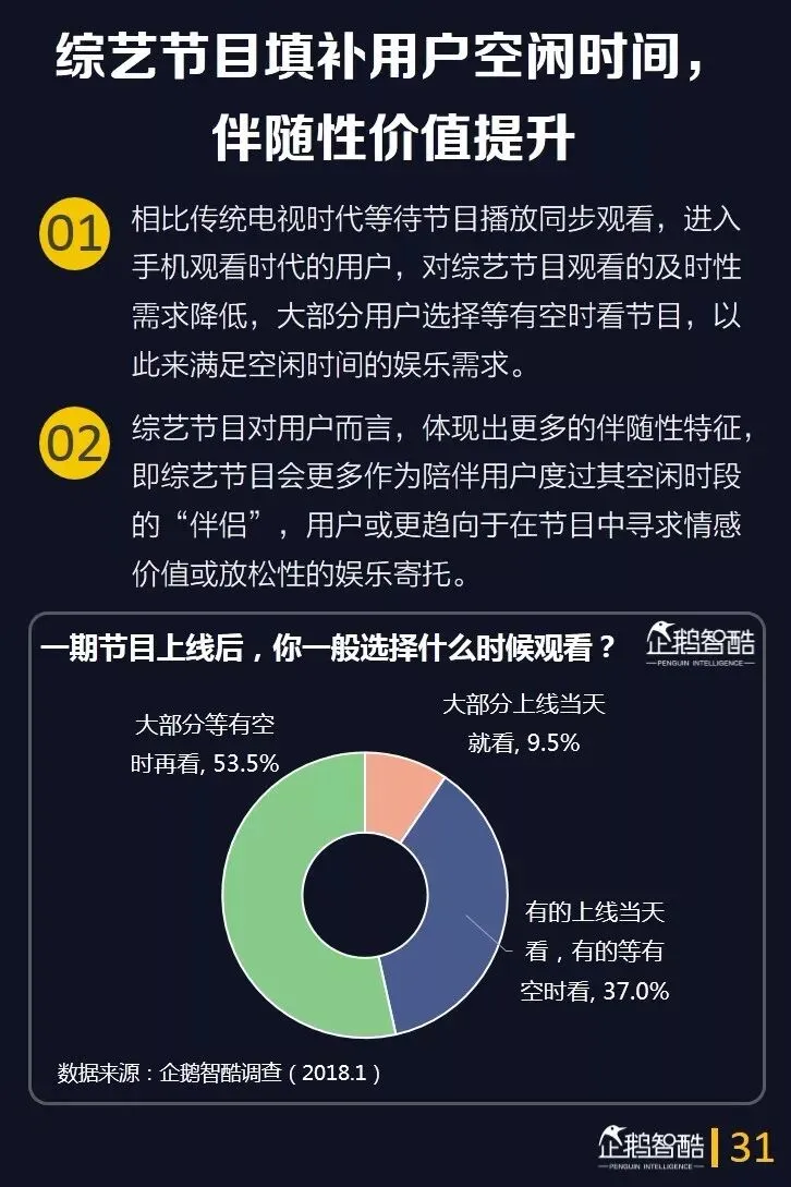 综艺节目对用户而言,体现出更多的伴随性特征,即综艺节目会更多作为陪伴用户度过其空闲时段的“伴侣”,用户或更趋向于在节目中寻求情感价值或放松性的娱乐寄托。
