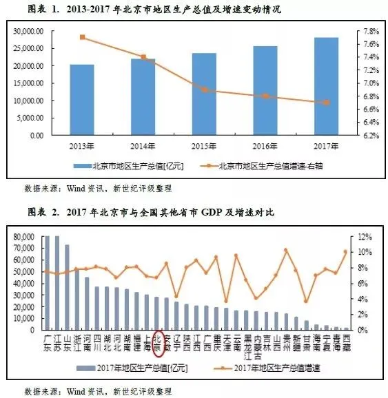 经济实力:北京市是我国的首都,地理位置优越,属东北平原和内蒙古高原进入黄淮海平原和黄土高原的交通要道,在“京津冀一体化”和“一带一路”战略建设中占有重要地位。北京市地区经济规模和人均GDP在全国排名前列,经济发展水平较高, 2017年,北京市实现地区生产总值2.80万亿元,位居全国各省市[1]第12位,较上年排名相同。从单一城市经济规模看,北京市位居第2位,仅略低于上海。当年全市人均地区生产总值达到12.90万元,超越上海,跃居全国各省市首位。北京市产业结构相对合理,第三产业占比突出,以金融、信息服务、科技服务等产业为主,2017年三次产业结构比例为0.4:19.0:80.6。2018年前三季度,北京市实现地区生产总值2.15万亿元,同比增长6.7%,产业结构持续优化,但受PPP项目整顿、房地产投资继续下行、落实减量发展战略等因素影响,当期固定资产投资同比下降12.7%。未来北京市将持续推动产业升级,中心城区的制造型企业将逐步向津冀地区疏解,虽然短期内产业转型升级会对北京市经济增长产生一定的负面影响,但是长期来看,产业的转型升级对缓解其人口压力和带动区域经济持续发展具有较强的促进作用。