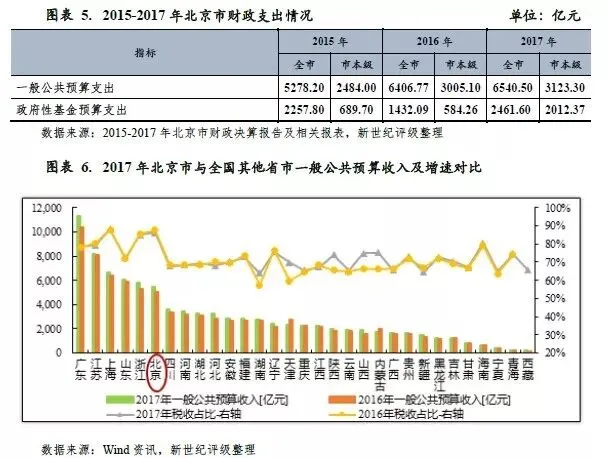 得益于经济发展,北京市一般公共预算收入持续增长,税收占比高,但增速有所放缓;政府性基金预算收入受土地供应增加影响,2017年明显回升;北京市财政自给率高,对转移支付依赖性低。考虑到北京市产业和人力资源聚集能力较强,未来北京市财政收入仍将稳步增长。