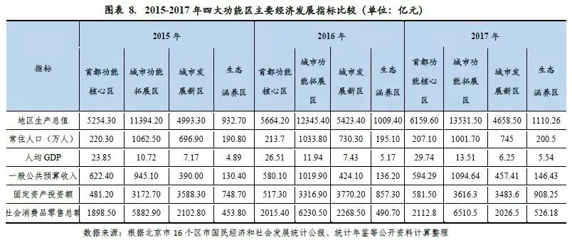 从下辖各区经济情况看,2017年北京市各区经济保持稳健增长,但各区经济发展较不均衡,其中首都功能核心区和城市功能拓展区经济实力较强,是北京市经济的主要支撑区,区域产业基础良好,经济发展水平相对较高;城市发展新区是北京市战略发展的新空间和推进新型城市化的重要着力区,区域经济在北京市处于中等水平;生态涵养区产业以生态农业为主,经济发展水平相对落后。