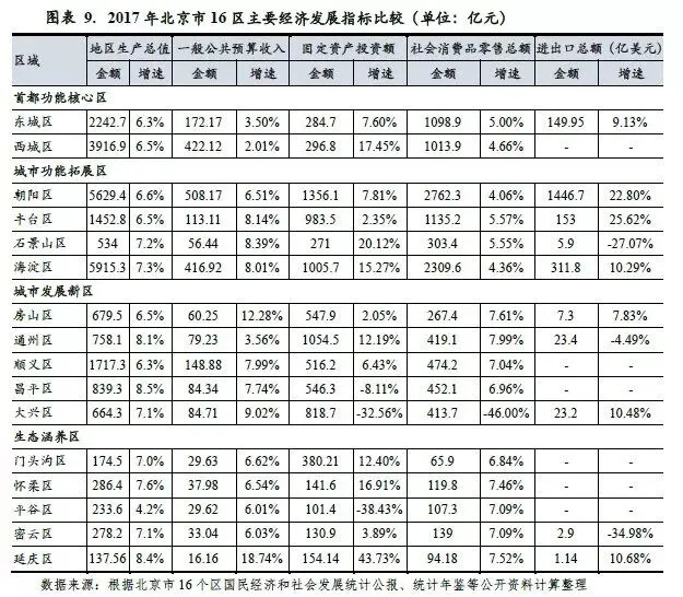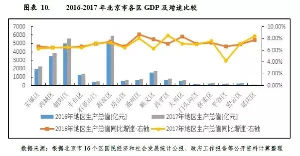从区域经济发展水平看,北京市各区经济发展有着明显的分工。2017年首都功能核心区和城市功能拓展区生产总值合计占北京市各区生产总值的77.34%,是北京经济的主要支撑区,区域产业基础良好,经济发展水平相对较高。其中,海淀区2017年实现地区生产总值5915.30亿元,排名各区第一,海淀区拥有科技、创新力量的中关村,聚集了大批国内外著名的高新技术企业,特别是信息服务业已经成为海淀区第一大新兴行业;此外海淀区高校云集,旅游景点丰富,拥有北京大学、清华大学及颐和园、圆明园、香山等著名高校、旅游景点。2017年朝阳区实现地区生产总值5629.40亿元,排名各区第二。朝阳区工业发达,是北京市重要的工业基地,区内集中有纺织、电子、化工、机械制造、汽车制造等工业基地,此外,北京CBD也坐落于朝阳区,是众多世界500强企业中国总部所在地,也是中央电视台、凤凰卫视、人民日报、北京电视台传媒企业的新址。西城区和东城区是北京市传统老城区,2017年实现地区生产总值分别为3916.90亿元和2242.70亿元,排名第三和第四,这两个区域是首都功能核心区,是北京市作为政治中心、文化中心和金融中心的标志,其中西城区拥有北京金融街,聚集了中国人民银行等金融监管部门及众多国内外大型金融机构和国企总部,是北京市资金、技术、知识密集度最高、税收增长最快的地区之一;东城区拥有王府井商业街、天安门广场等,全国重大政治活动和庆祝活动都在这里举行。中心城六区中的丰台区经济发展水平处于中等水平,工业产业主要集聚于中关村科技园区丰台园,当年丰台区实现地区生产总值1452.80亿元,位列北京16区中第6位。中心城六区中经济规模相对较弱的石景山区,早期因服务以首钢为代表的“京西八大厂”而建区发展,是传统的重工业区,其中首钢产值曾一度占到全区企业总产值的90%左右。为首都环保考虑,2005年起首钢涉钢产业整体外迁,北京重型机械厂等“八大厂”为代表的重工业也通过搬迁、合资转型等方式逐步移出石景山区。在经过了重工业调整期,石景山区逐步向国家级绿色转型发展示范区转型。目前石景山区是北京城区中山林资源最丰富、绿化覆盖率最高、人均拥有公共绿地最多的地区,当年实现地区生产总值534亿元,位列北京16区中第10位。