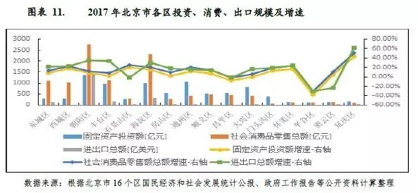 2017年北京市各区经济保持稳健增长,但北京市各区经济发展较不均衡,其中首都功能核心区(东城区、西城区)和城市功能拓展区(朝阳区、丰台区、石景山区、海淀区)共同组成中心城六区,经济实力较强,是北京市经济的主要支撑区,区域产业基础良好,经济发展水平相对较高,2017年中心城六区生产总值合计占北京市各区生产总值的77.34%,其中海淀区和朝阳区GDP超过5000亿元,投资、消费和出口规模也处于各区领先地位;城市发展新区(房山区、通州区、顺义区、昌平区、大兴区)是北京市战略发展的新空间和推进新型城市化的重要着力区,区域经济在北京市处于中等水平, 2018年9月19日,北京市发改委发布《促进城市南部地区加快发展行动计划(2018-2020年)》,将进一步解决首都南北发展不平衡,城市发展新区将迎来更好的发展机遇;生态涵养区(门头沟区、怀柔区、平谷区、密云区)是京津冀西北部涵养区的重要组成部分,经济发展水平相对落后,2017年各区地区生产总值不超过300亿元,投资、消费和出口规模也相对较低。