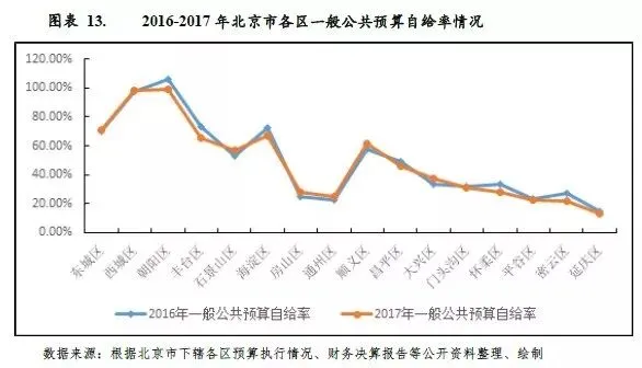 受产业结构和城市区位功能差异的影响,北京市各区之间一般公共预算收入规模差异较大。其中西城区、朝阳区和海淀区,三产发达,一般公共预算收入质量较好;但城市发展新区和生态涵养区中除顺义区外一般公共预算自给率均低于50%,收支平衡主要依赖于上级补助。