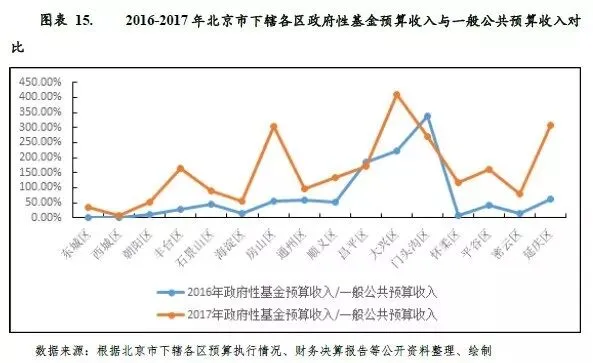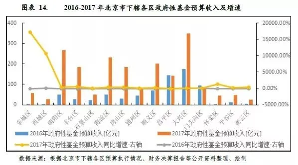 2017年,受土地开闸放量影响,北京市政府性基金预算收入大幅提升137.97%至3132.76亿元,北京市下辖区除门头沟区和昌平区小幅下降外,其他各区政府性基金预算收入均有明显提升,其中东城区和西城区2017年政府性基金预算收入超过2016年的100倍,主要系2016年的基数较低;丰台区、房山区和怀柔区超过5倍;朝阳区、海淀区、平谷区、密云区和延庆区均超过3倍以上;石景山区、通州区、顺义区和大兴区均超过0.7倍以上。