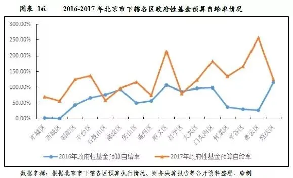受产业结构和城市区位功能差异的影响,北京市各区财政实力差距明显,中心城六区中西城区、朝阳区和海淀区,三产发达,一般公共预算收入质量较好,2017年一般公共预算收入规模均超过400亿元,税收收入占比在85%以上;而生态涵养区一般公共预算收入规模较小,税收占比也相对较低;此外城市发展新区和生态涵养区中除顺义区外一般公共预算自给率均低于50%,收支平衡主要依赖于上级补助。受土地供应加速影响,2017年北京市大部分区域政府性基金预算收入均有明显提升,当年大兴区政府性基金预算收入为348.28亿元,排名各区首位;首都功能核心区作和生态涵养区政府性基金预算收入规模均相对较小,2017年均不超过80亿元。与一般公共预算收入规模相比,城市发展新区和生态涵养区地方财力对政府性基金预算收入的依赖度普遍较高,中心城六区地方财力对政府性基金预算收入的依赖度相对较低。