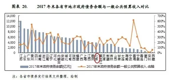 以地方政府债务余额与一般公共预算收入规模相对比,2017年末北京市地方政府债务余额与当年一般公共预算收入的比率为71.39%,位列全国各省第32位,处于相对较低水平,债务压力轻。