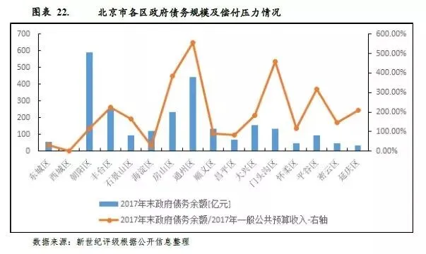 从政府债务偿付压力看,2017年末通州区、门头沟区、房山区和平谷区政府债务偿付压力相对较大,当年末政府债务余额与2017年一般公共预算收入的比率均超过300%;东城区、西城区、海淀区、顺义区和昌平区政府偿债压力相对较轻,当年末政府债务余额能够被2017年一般公共预算收入所覆盖。