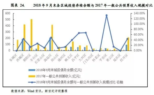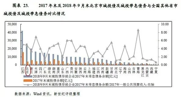 以城投债存续余额与一般公共预算收入规模相对比, 2018年9月末北京市城投债存续余额是其2017年一般公共预算收入的0.68倍,处于中等水平,较上年同期基本持平。