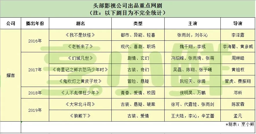 目前,耀客2019年待播网剧有腾讯定制的古装奇幻探案剧《大宋北斗司》、与新丽联合出品的《狼殿下》,皆为古装+热门元素的组合模板。