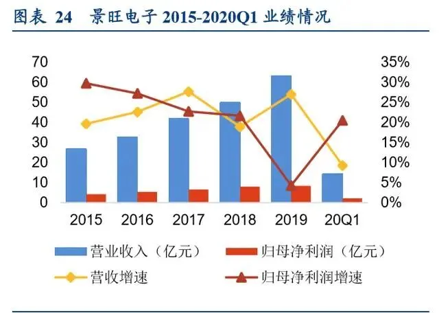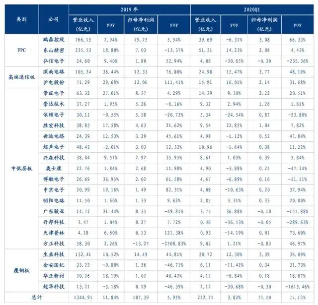 通信PCB景气最好,三家龙头企业深南电路、沪电股份、生益科技业绩依然维持较快增速,受疫情冲击最小。其中,深南电路 2020Q1 实现营收 24.98 亿元(+15.47%),归母净利润 2.77 亿元(+48.19%);沪电股份 2020Q1 实现营 收 15.81 亿元(+16.01%),归母净利润 2.14 亿元(+31.68%);生益电子 2020Q1 实现营收 30.72 亿元(+12.30%), 归母净利润 3.39 亿元(+36.09%)。一季度业绩高增长主要来自通讯板需求的高景气,5G 基站及数据中心需求拉动 相应 PCB 出货增长强劲。5G 建设周期有望持续较长时间,通信 PCB 有望长期享受行业发展红利。消费电子FPC企业中,东山精密、鹏鼎控股2020Q1业绩优异,苹果链软板公司表现超市场预期。其中东山精密2020Q1 实现营收 51.31 亿元(+14.23%),归母净利润 2.08 亿元(+4.43%);鹏鼎控股 2020Q1 实现营收 39.69 亿元(-6.31%), 归母净利润 3.08 亿元(+66.33%)。业绩超预期主要是由于苹果产业链在一季度疫情冲击下加大安全库存备货,产 业链 3-4 月拉货强劲。展望全年,下半年 5G 版 iPhone 与 iPad Pro 值得期待,苹果终端中 Airpods/Watch/Pad 增长势 头依然强劲,有望拉动相应的软板需求持续增长。除通信PCB、消费电子FPC企业外,优质PCB如景旺电子、胜宏科技克服疫情负面影响,业绩影响有限。景旺电子2020Q1实现营收14.39亿元(+9.30%),归母净利润 2.22 亿元(+20.51%);胜宏科技 2020Q1 实现营收 9.54 亿元(+22.85%),归母净利润 1.04 亿元(+7.82%)。其中胜宏科技利用高自动化优势,承接大量转移订单,3 月 单月稼动率远超同期,公司有望在 Q2 维持高稼动率,2020 年上半年业绩和利润增长可期。2020 年是 5G 基站建设 大年,叠加 5G 云计算驱动显卡、服务器需求强劲,料将带动 PCB 产业景气上行。