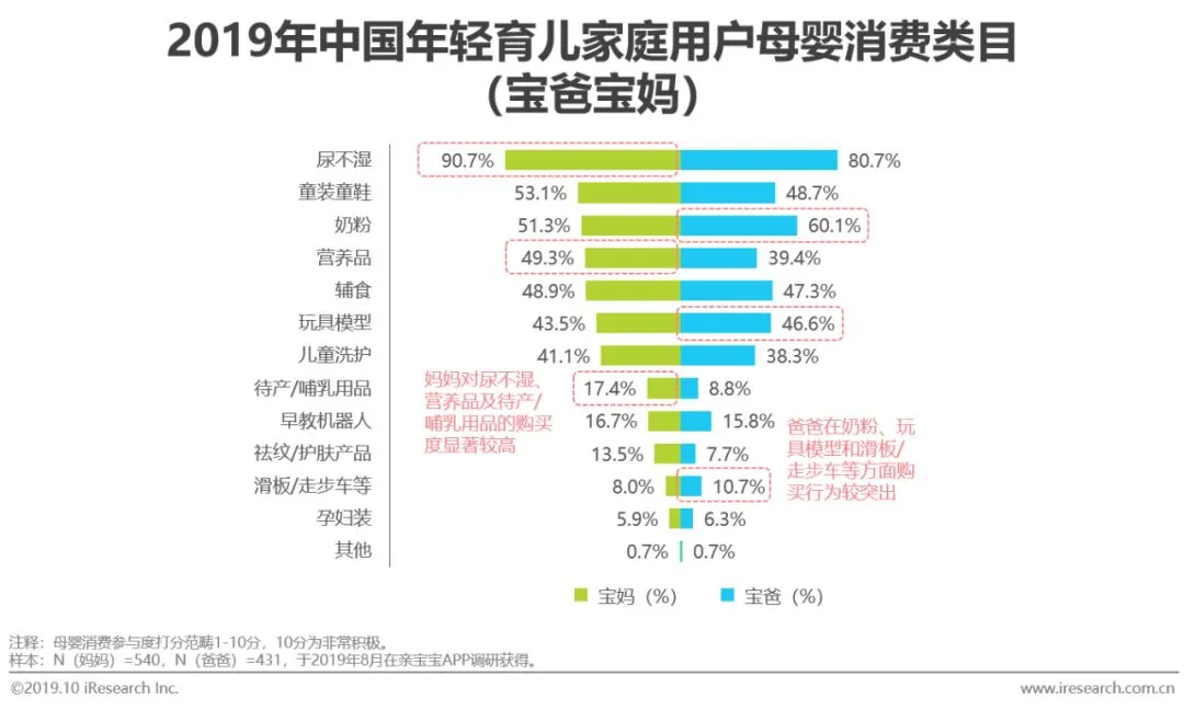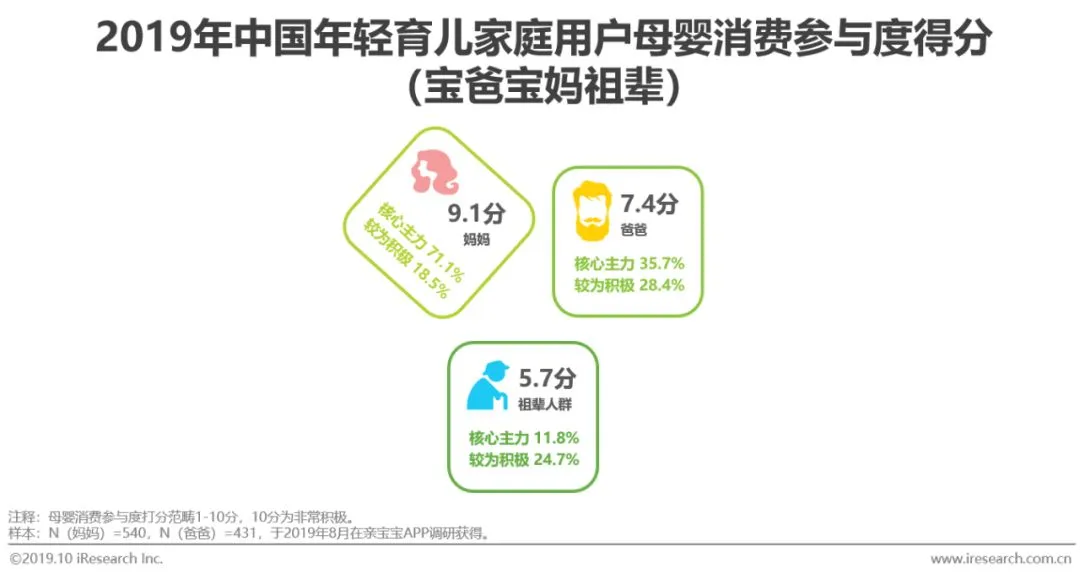 剁手党属性显著:宝妈是家庭核心消费主力,母婴消费参与度得分高达9.1分;宝爸不甘示弱,母婴消费参与度得分达7.4分
