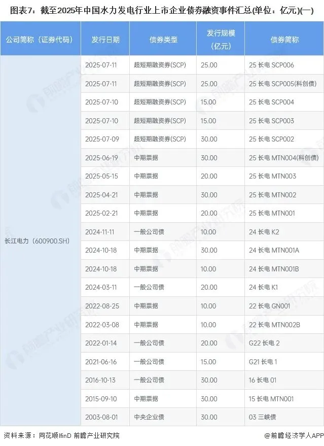 相较于股权融资事件,水力发电行业债券融资事件数量更多。根据过去五年统计的行业上市企业债券融资事件情况,债券类型主要包括短期融资券、公司债、中期票据、非公开定向债务融资工具(PPN)等。从企业的债券融资数量和金额来看,长江电力的融资规模遥遥领先。据统计,过去五年长江电力的债券融资金额超过380亿元。