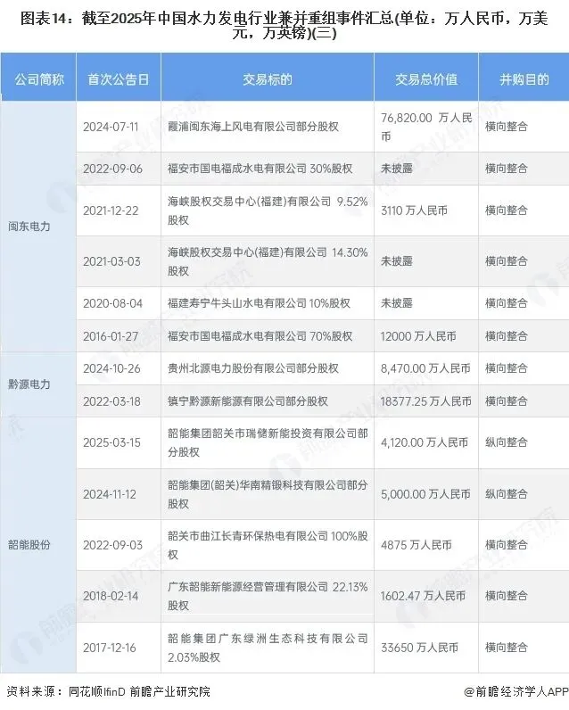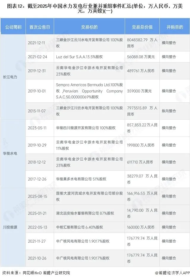 从产业链情况来看,水力发电行业上游主要包括工程咨询、原材料与设备供应商,中游主要是水力发电项目建设和运营,下游主要涉及售电主体和电力用户。中游企业兼并重组的主要目的为横向整合以扩大市场规模。同时,随着新能源技术的不断完善以及政策的扶持,中游企业从单一水电扩展到水风光储并举、多能互补、构建水风光储一体化发展格局已成为趋势,未来以多样化业务为目的的兼并重组事件将会增加。