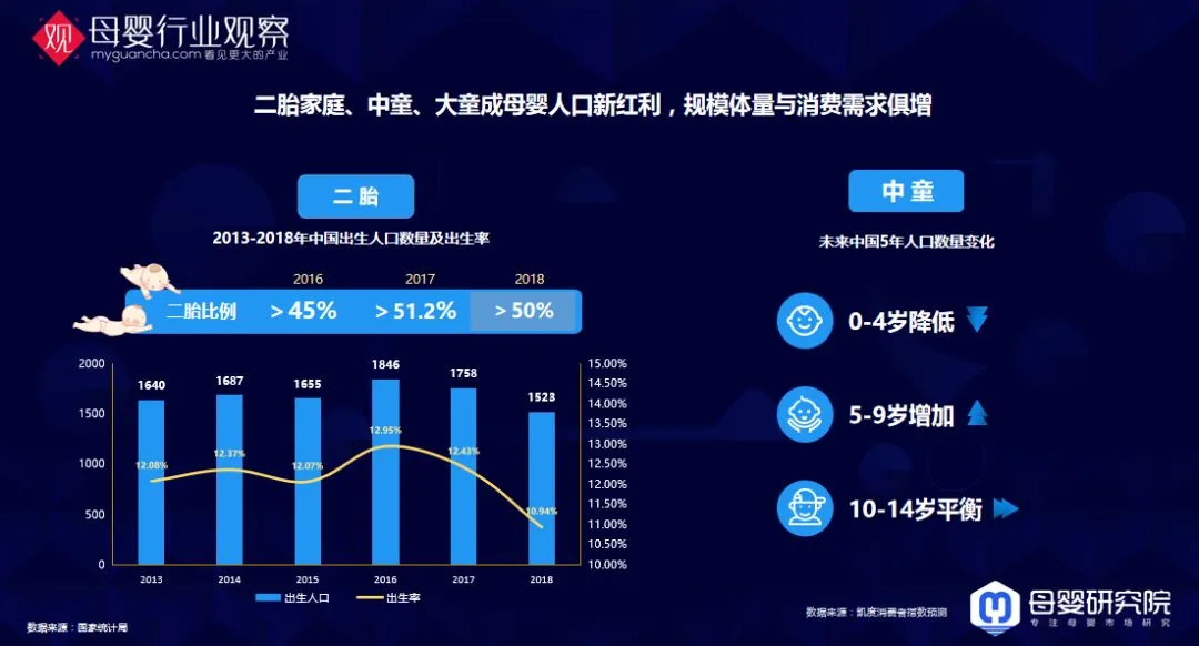二胎家庭、中童、大童成母婴人口新红利,规模体量与消费需求俱增。我们看到2017年开始二胎率已经超过了一半,因为这个数字,整个母婴行业的结构组成会发生一些潜移默化的变化。例如我们说一胎照书养,二胎当猪养,二胎妈妈对产品的需求,对母婴对育儿的认知是不一样的。未来中国5年人口数量变化,0-4岁的人口是下降的,5-9岁是增加的,10-14岁是平衡的。