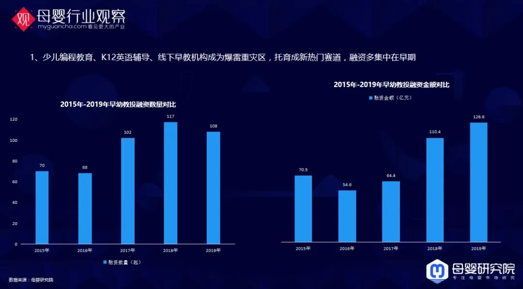 具体到细分领域:2019年很多早幼教机构跑路,在为前些年的泡沫买单。少儿编程教育、K12英语辅导、线下早教机构成为爆雷重灾区;托育成新热门赛道,融资多集中在早期。