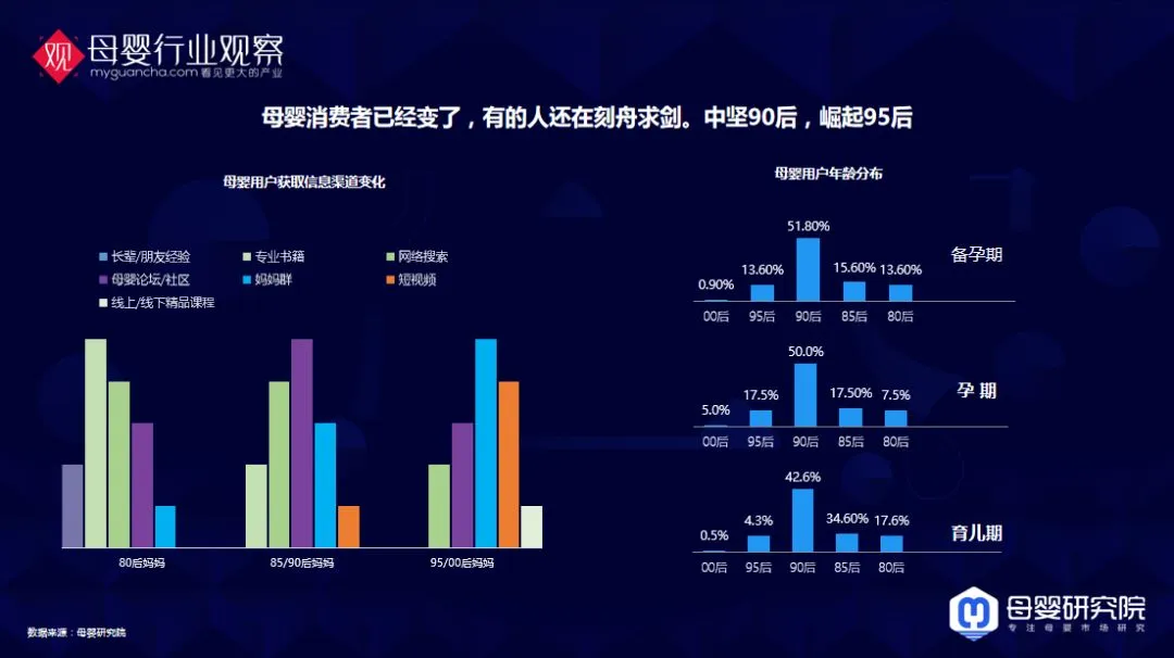 80后、85后、90后、95后、00后妈妈信息获取渠道已经发生了很大的变化,95/00后妈妈,短视频和微信群是她们获得信息的第一第二途径,80后是完全不一样的,她们还去搜索,看专业书籍。同时我们看到在备孕期、孕期和育儿期,90后和95后已经是绝对的中坚主力。