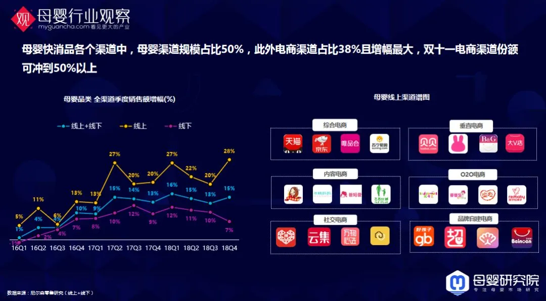 母婴快消品各个渠道中,母婴渠道规模占比50%,电商渠道占比38%且增幅最大,双十一电商渠道份额可冲到50%以上。线上的份额还在增长,尤其是一些标品化的产品。