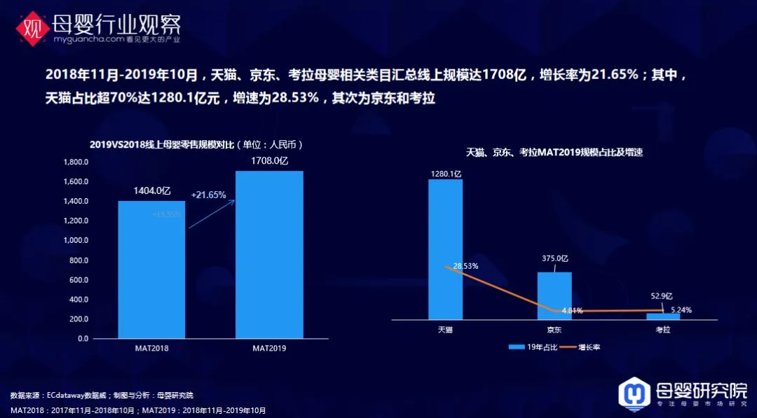我们统计了天猫、京东、考拉等一些线上的主流平台母婴相关类目数据,总规模达1708亿,增长率约为21%,其中天猫占比最大,超过70%。