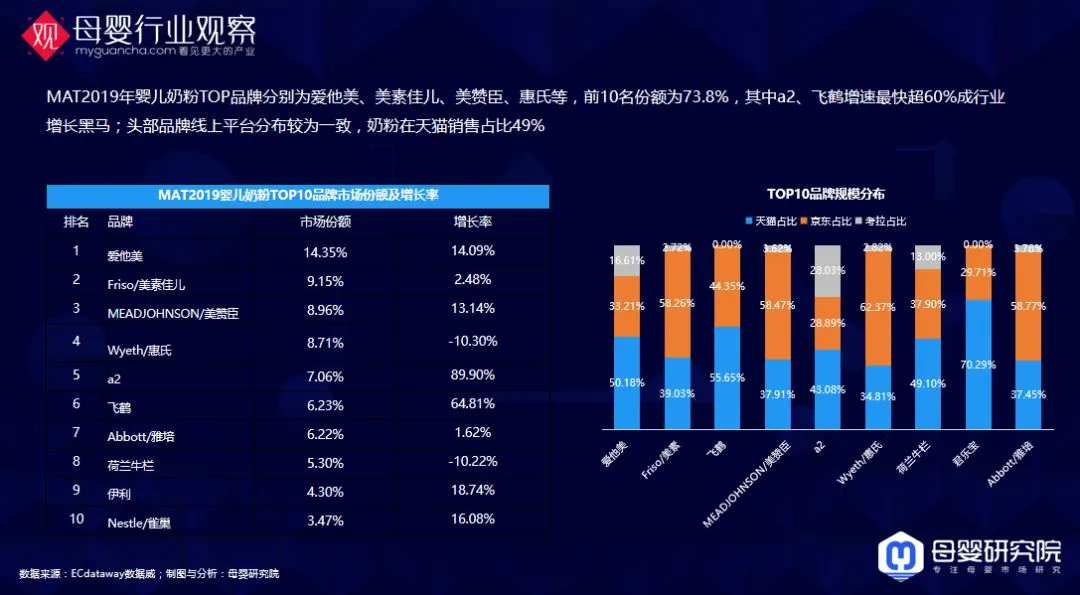 我们再看一下线上的排行,哪些品牌销量是比较不错的,2019年婴儿奶粉TOP品牌分别为爱他美、美素佳儿、美赞臣、惠氏等。a2和飞鹤增长率超过60%。右边是个品牌在不同平台的销售占比,京东、天猫平台上奶粉的销售占比差别不是很明显,说明这些品牌还是有很强的品牌力,这些平台不会对它们做过多的二选一的限制。