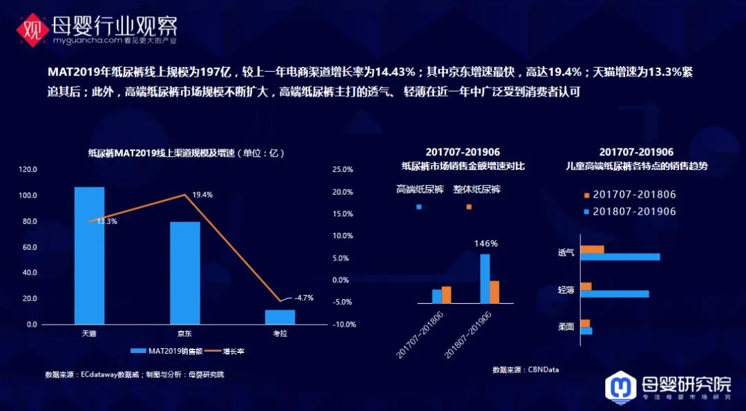 我们知道有很多家纸尿裤企业其实已经倒闭了,还是体量比较大的,2019年开始为前些年的冒进、泡沫买单。2019年纸尿裤线上规模为197亿,较上一年电商渠道增长率为14.43%;其中京东增速最快,高达19.4%;天猫增速为13.3%紧追其后。