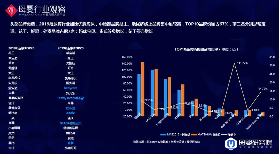 我们看头部纸尿裤品牌格局,纸尿裤的榜单排名变化的非常大,2019年前三名分别是帮宝适、花王、好奇,外资品牌占据7席;妈咪宝贝、雀氏等负增长,花王停滞增长。