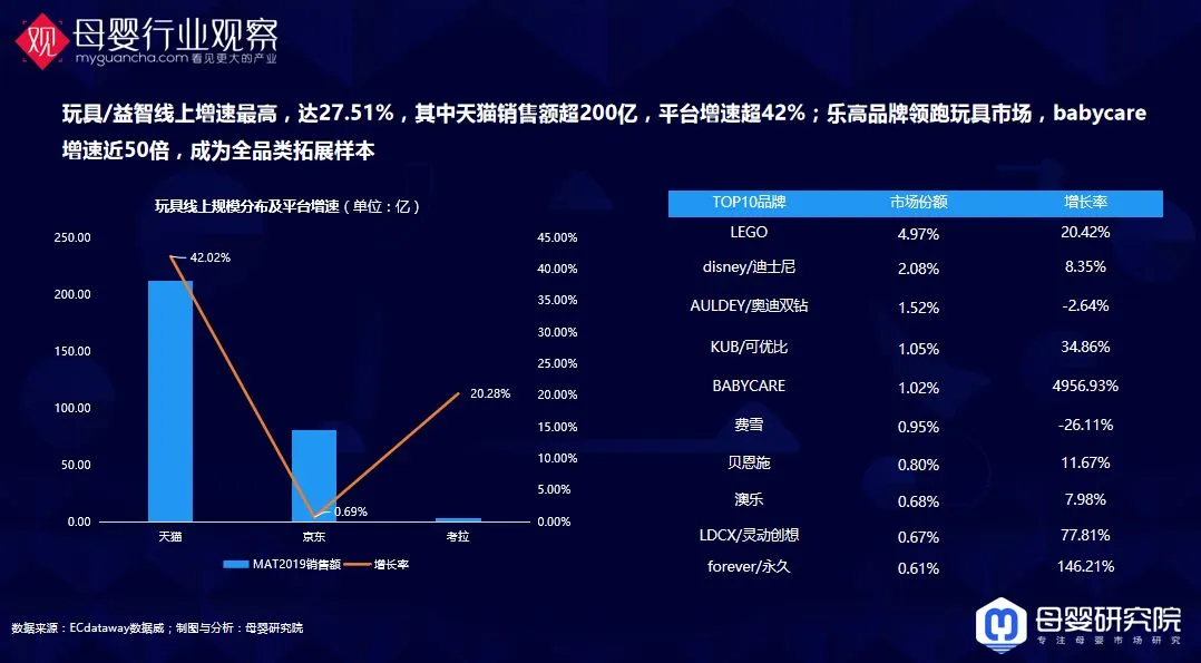 玩具/益智线上增速最高,达27.51%,乐高还是第一,babycare增速近50倍。