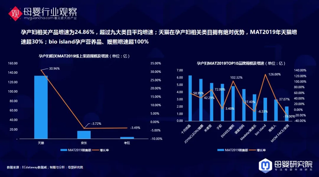 孕产妇相关的消费,这几年在爆发,孕产妇越来越关注到自己本身了。我们看到bio island、嫚熙增速都是非常快,他们的体量已经不小了,还在100%的增长,说明这个市场的需求还是不一样的。