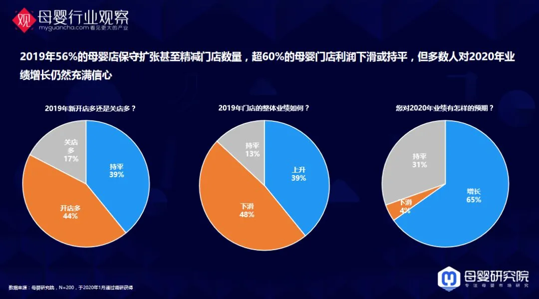 母婴研究院近期的调研报告显示,2019年56%的母婴店保守扩张甚至精减门店数量,超60%的母婴门店利润下滑或持平,但多数人对2020年业绩增长仍然充满信心。