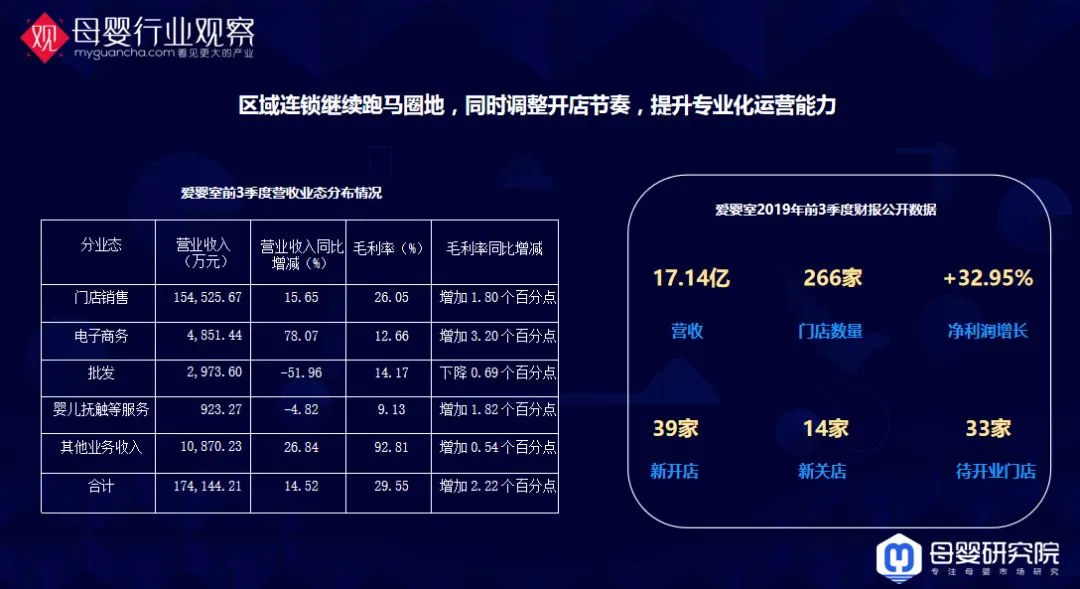 再看线下门店的一些玩法,比如说直营为主的,加盟为主的,还有母婴B2B平台的,实际上每一家做母婴连锁的或多或少都在加盟,只是战略意义和定位不同,组成比例不同。其中,直营做规模还是值得商榷的事情,但是无论哪一种模式你做到极致,结果不会差,比如轻门店重供应链的爱婴岛,今年的利润很好。(2019母婴行业观察年终报告领取方式见文末)
