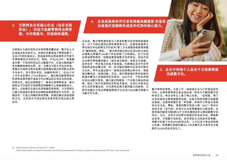 新零售即是端到端数字化,我们仍处于早期阶段。所有的品牌和零售商都需考量数字化对其整个价值链的影响。生态系统和伙伴关系变得越来越重要,但是切勿忽视打造能够形成竞争优势的核心能力。
