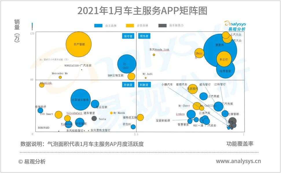 易观分析对比主要汽车品牌2020年销量和车主服务APP主要功能覆盖情况,进行二维矩阵分析,获得车主服务实力矩阵图(简版)。按照车销量和车主服务功能覆盖情况分布,将所有行业参与者分为4个象限,分别为销量&功能覆盖率双高的领先者象限、销量稍低但功能覆盖率高的创新者象限、销量较高但功能覆盖率较低的保守者象限和销量与功能覆盖率双低的补缺者象限。另外, 易观分析根据易观千帆的2021年1月用户规模作为气泡面积参考依据。