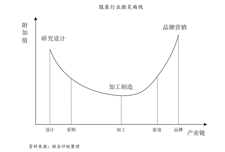 另一方面服装行业产业链较长,行业下游消费需求变化日益加快;服装行业价值链中品牌营销渠道运营附加值最高,其次为研发设计,而加工制造环节附加值最低,下游消费需求变化有利于行业向微笑曲线两端延伸。