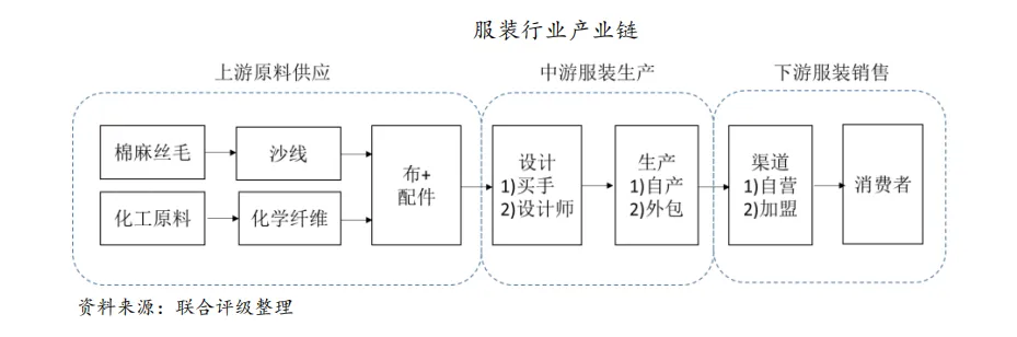 服装行业处于纺织服装产业链中下游,从目前我国行业终端收入来看,内销品牌零售企业占比约为40%,外销加工制造约为60%,但内销品牌企业占比逐渐提升。