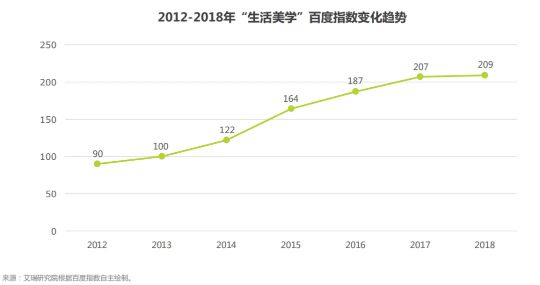 根据百度指数变化趋势,“生活美学” 能代表消费者“审美意识”觉醒的关键词指数呈上升趋势,其中,“2012年,生活美学”年度平均搜索指数仅为90,2018年提升至209。