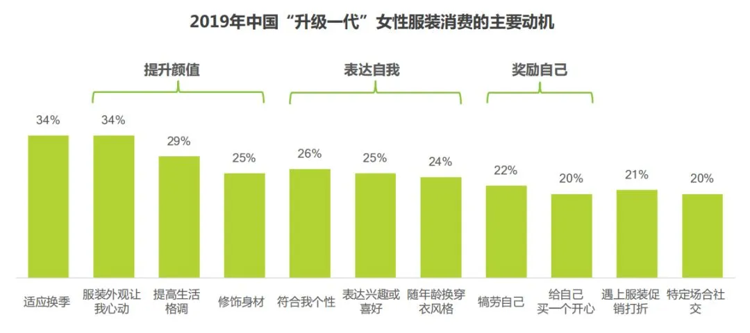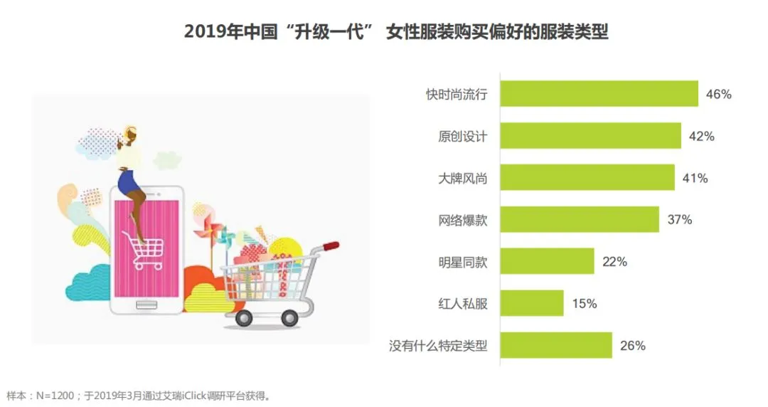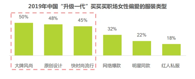 “升级一代”女性中购买的服装类型中,首选“快时尚流行”,占比46%,其次是带有“原创设计”服装类型,占比42%;较大品牌的服装风格,即“大牌风尚”也代表着最新的流行元素,占比41%。