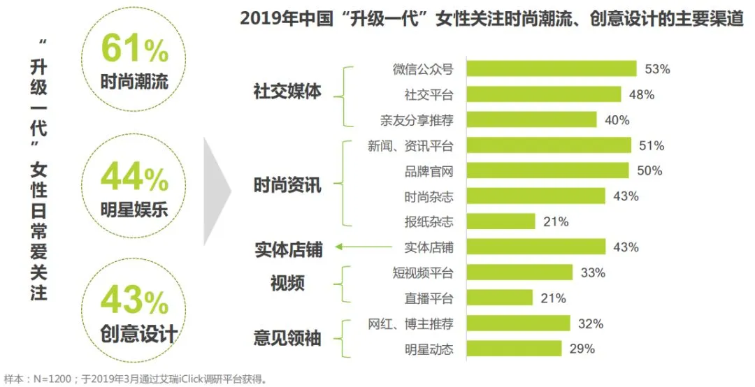 数据显示61%“升级一代”女性在日常生活中会主动关注时尚潮流,44%会关注明星娱乐动态,并留意创意设计。