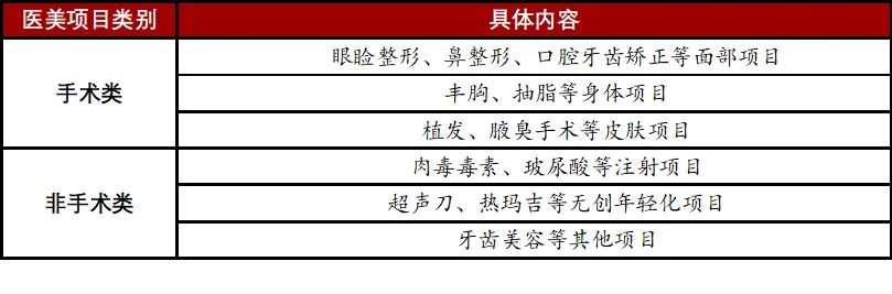 根据卫计委于2002年发布的《医疗美容服务管理办法》第二条规定,医疗美容是指运用手术、药物、医疗器械以及其他具有创伤性或者侵入性的医学技术方法对人的容貌和人体各部位形态进行的修复与再塑。轻医美是介于手术整形和生活美容之间的专业医疗美容项目,指用无创或微创医学疗法满足求美诉求,主要以注射、超声、激光等项目为主。相比于手术类医疗美容服务,轻医美(非手术类医美)由于安全性高、康复时间短、价格大众化等特点受到越来越多消费者的青睐。1.2 分类