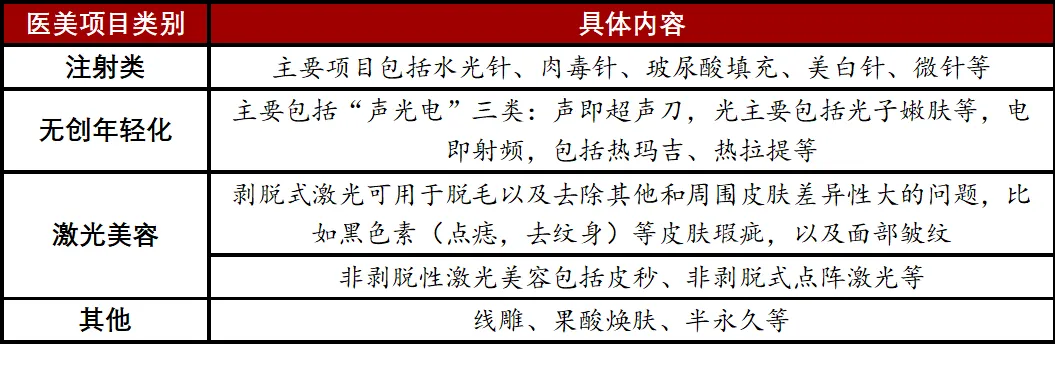 轻医美即上文所述非手术类医美手段。与手术整形相比,轻医美具有操作手段灵活、创伤小、恢复期短、风险低等特点。与生活美容(化妆品、非医疗器械等非医疗性手段)相比,医疗美容能够深入皮肤真皮深层,功效更明显。目前,轻医美项目主要包括四类——注射类、无创年轻化、激光以及线雕等其他项目。(1)注射类医美主要应用于皮肤美容科和皮肤外科,适用于组织修复与再塑等。主要项目包括水光针、肉毒针、玻尿酸填充、美白针、微针等。(2)无创年轻化为非侵入式美容医疗,主要包括“声光电”三类:声即超声刀,光主要包括光子嫩肤等,电即射频,包括热玛吉、热拉提等。(3)激光美容根据能量的区别可分为剥脱式和非剥脱式。剥脱式激光可用于脱毛以及去除其他和周围皮肤差异性大的问题,比如黑色素(点痣,去纹身),红色素(血管瘤),还有其他丘疹,赘生物等皮肤瑕疵,以及面部皱纹。非剥脱性激光美容包括皮秒、非剥脱式点阵激光等。(4)其他常见轻医美项目包括线雕、果酸焕肤、半永久等。1.3 轻医美行业发展历程