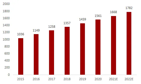 根据国际美容整形外科学会(ISAPS)的报告,2015年-2019年全球医美市场规模稳定增长,CAGR约为8.94%。2019年,全球医美市场规模为1,459亿美元,同比增长7.5%。未来预计保持8%左右的增速,2022年市场规模将达到1782亿美元。图:2015-2022年全球医美行业市场规模(亿美元)1.4.2 中国医美市场规模