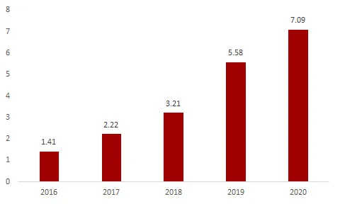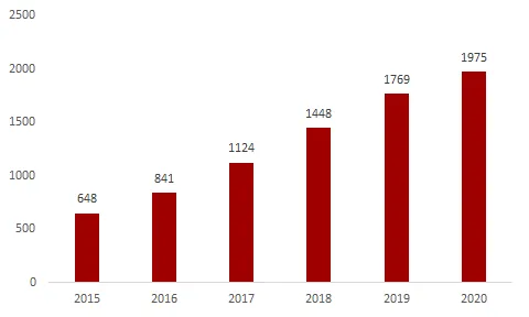 对标美国、韩国等医美大国,我国医美产业起步晚,发展历程可大致分为三个阶段:1949-2008年,以公立医院首次设立整形外科为标志,国内医美产业开始萌芽;2008-2014 年为行业起步阶段,上游原材料生产商发展态势良好,带动民营医疗机构涌现;2014 年至今,资本助力下行业繁荣发展,“互联网+”浪潮催生互联网医美平台。1949年,北京大学第三医院国内首次设立整形外科,标志着中国医美行业的萌芽。此后,多家公立医院纷纷设立整形科,比如中国医科学院外科整形医院、上海交通大学医学院附属第九人民医院等。这段时期,医美的主要需求来自于伤后修复、矫正等被动整形。上游原材料生产商发展态势良好,带动民营医疗机构涌现。许多知名外企入驻中国市场,创造了较好的产业氛围和发展环境,中国本土企业也不断涌现,2008年华熙生物香港上市、2010年华韩整形成立,国内民营医美机构大量涌现,大型民营连锁医院、小型民营医美诊所纷纷建立。颜值经济带动行业快速扩张,加之消费升级和移动互联网浪潮,互联网医美平台深受资本青睐,互联网医美平台发展壮大,逐渐成为医疗美容产业链的枢纽环节。2014年以来,更美、悦美网等互联网医美平台深受资本市场青睐,已获多轮融资,国内互联网医美龙头企业新氧已于2019年在纳斯达克主板发行存托凭证上市。1.4 医美行业市场规模