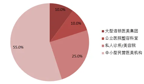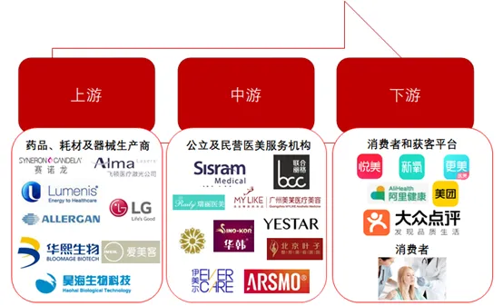 医美行业产业链中游是医美服务机构,主要包括公立医院、民营大型连锁医院、中小型民营医美机构等。由于进入门槛较低、竞争格局分散等原因,医美产业中游参与者众多,且存在大量的中小型机构和非正规机构。根据艾瑞数据显示,2019年我国具备医疗美容资质的机构约13,000家,其中医院类占29.1%、门诊部类占32.9%、诊所类占38.0%。从整体上看,民营医美机构和小型诊疗机构占据了市场的绝大部分空间,一部分原因是由于这些机构有服务以及营销优势。但是由于公立医院具有技术优势,且管理规范、公众信任度高,因此公立医院仍然是国内医美行业非常重要的组成部分。此外,前述白皮书显示,2019年国内非法开展生活美容类的店铺以及非法开展医疗美容项目的机构却多达80000余家,合法合规开展医美项目的机构仅占行业12%。此外,医美事故高发于黑医美,平均每年黑医美致伤致残人数约为100,000人,多数消费者投诉报案无门,维权异常艰难,严重影响着他们的生活。总体来说,中游服务机构竞争格局分散、合规性有待加强,同时对上下游的议价能力较低。在监管趋严的背景下,医美中游正处于整合拐点,行业将向规范化方向整合。1.5.3 下游分析