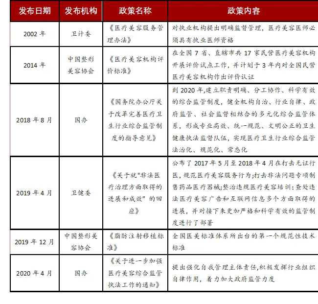 根据国家卫生健康委员会规定,美容医院的准入标准是:至少要有6名相关专业副主任医师资格以上的主诊医师,和至少2名主管护师资格以上的护士;美容诊所的准入标准是:至少有5名执业医师,其中至少要有1名相关专业副主任医师资格以上的主诊医师,和至少1名护师资格以上的护士。与美、日、韩等医美发展相对成熟的国家相比,我国人均整形外科医生的数量远远不足,而在国内培养一个高技术医美人才的大概需要10年左右时间,这造成国内医美专业人才的稀缺。相对于国内庞大的需求,医生数目远远不够,人才成为医美机构发展的关键因素。4. 轻医美行业相关政策分析